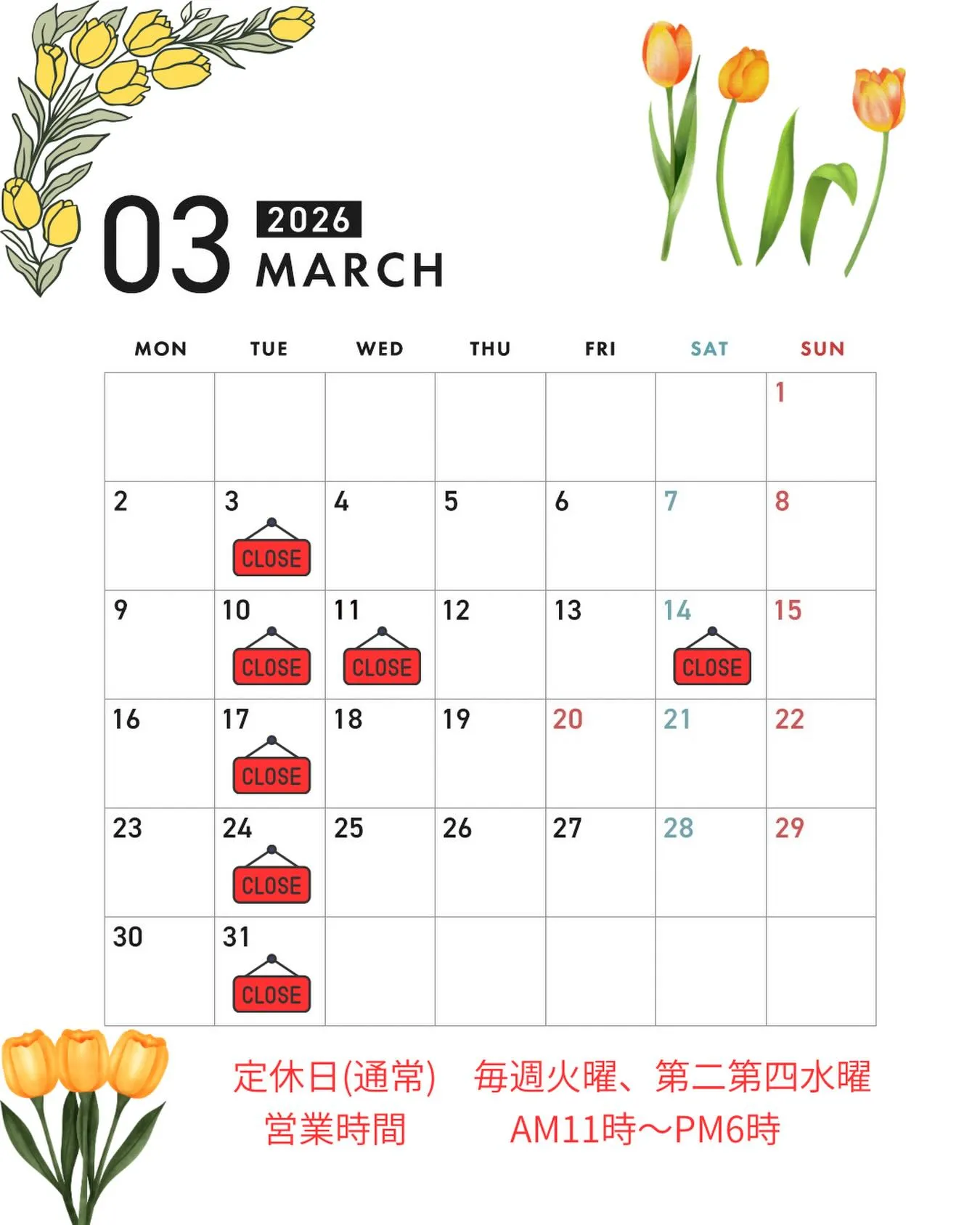 【3月営業日のお知らせ】 2026/03/03 【3月営業日のお知らせ】 今月も少し変則的な営業となってしまいますが、よろしくお願いいたします🙇♀️ 3月14日(土)は都合によりお休みをいただきます。 第2水曜日は通常通りお休みとなりますが、 その代わりに第4水曜日(3月25日)は営業いたします。 ご来店の際は営業カレンダーをご確認ください🌿 よろしくお願い致します🙇♀️